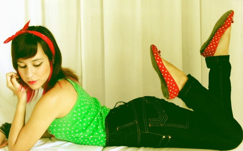 Gabriela Chame, uma das mais estilosas Capricho, combinando jeans com poá (bolinhas), num estilo meio Pin-Up!