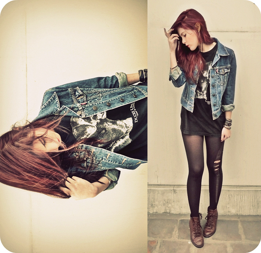 Uma garota estrangeira com sua foto no LookBook, usando jeans com preto, num estilo mais glam rock, roquinho.
